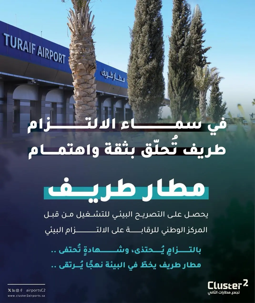 حصل مطار طريف بمنطقة الحدود الشمالية، أحد المطارات التابعة لشركة تجمع مطارات الثاني، على التصريح البيئي للتشغيل من المركز الوطني للرقابة على الالتزام البيئي.