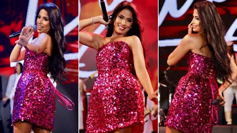 تألقت المطربة نانسي عجرم ببدلة باللون الرصاصي اللامع، ونسقت أسفلها توب بنفس اللون.