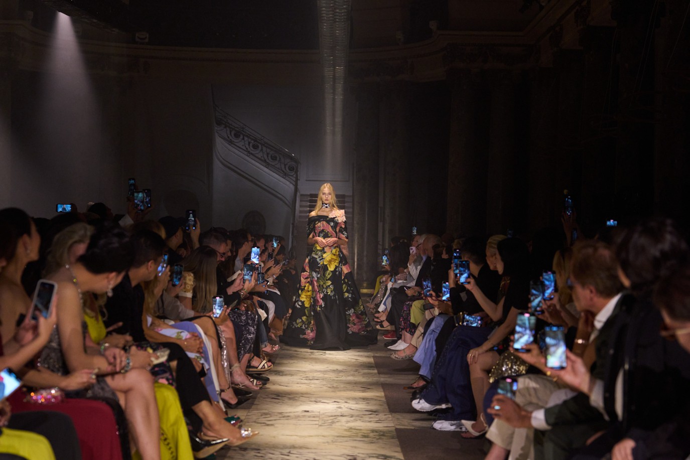 تلعب الأحجام غيرُ المتوقّعة دور البطولة؛ لتضفي دراما وحيوية على الفساتين المصنوعة من قماش الموار، المُصممة لتكشف عن لمحة من الجلد، أو لتُبرز الخصر بخفة مسرحية. أما لوحة الألوان؛ فتُعيدنا إلى حلاوة الماكرون الباريسي: البيج، الوردي الفاتح، الأزرق المائي، والنعناع، في تبايُن ساحر مع الأسود الإمبراطوري والذهبي الملوكي.