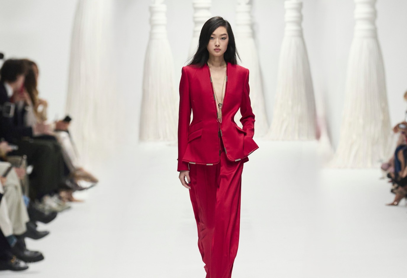 وبدورها نفذت دار جيني Genny البدلة الحمراء الكرزية المصنوعة من الساتان اللامع وتتألف من جاكيت بقصة Peplum تتسع من الخصر نزولاً وهي منسقة مع سروال واسع حريري يضيق عند الكاحل، ويمكنك تنسيق حذاء أبيض جلدي وتزيني بقلادة طويلة ذهبية لزخرفة الياقة التي اتخذت شكل سبعة.