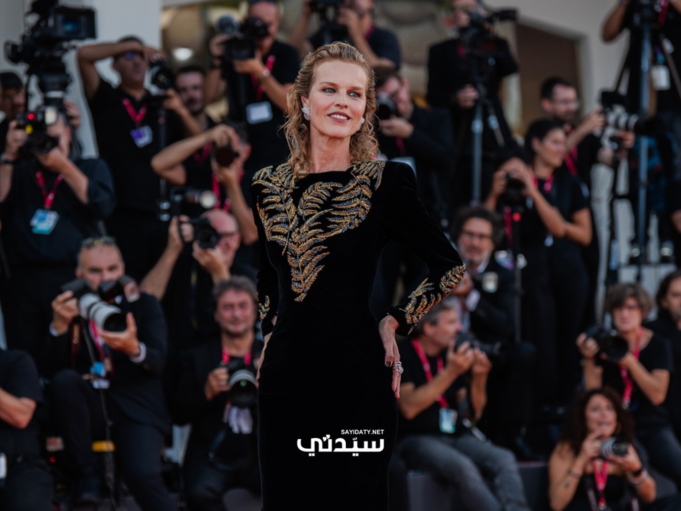 أعجبتنا إطلالة عارضة الأزياء إيفا هيرزيغوفا Eva Herzigová بفستان أسود مخملي أنيق طويل يتميز بقصة كلاسيكية تبرز القوام بانسيابية ورقي، أكثر ما يلفت الأنظار في التصميم هو الزخرفة الذهبية الفاخرة على منطقة الصدر والأكمام، والتي جاءت بشكل يشبه أوراق الشجر أو الأجنحة، ما أضفى لمسة فنية درامية تعكس الفخامة والرقي، وتميز الفستان بأكمام طويلة ضيقة تضيف لمسة من الرقي، ونسقت معه حذاء مفتوح بكعب عالٍ بلون نيود، ما أضاف أناقة للإطلالة.