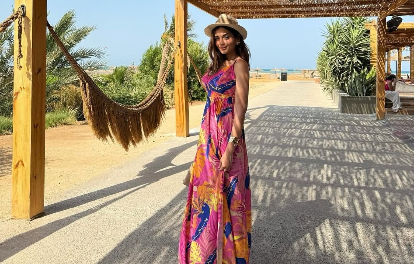 نسقت ملك زاهر قبعة القش الصيفية مع فستان صيفي ملون بحمّالات رفيعة، وتصميم طويل وأكملت إطلالتها بالأكسسوارات البيج التي جمعت بين حقيبة كلاتش وسليبر صيفي بتصميم عصري، وهي إطلالة مثالية لتتألقي في العطلات الصيفية.