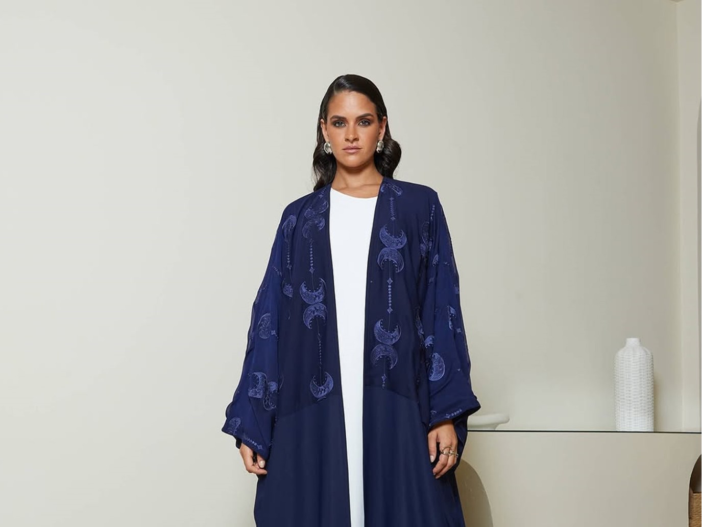 تعود موضة العبايات البشت الواسعة بقوة في ربيع وصيف 2025، والتي تؤمن لك إطلالة محتشمة تخفي جميع عيوب الجسم، خاصة أن قصتها تتسع من عند الخصر، كما في العباية المصممة باللون الأزرق النيلي من ماركة Des Farah، والتي زينت بتطريز على شكل هلال في القسم العلوي منها، ارتديها على غرار العارضة مع فستان أبيض سادة، وانتعلي صندلاً فضياً بكعب عالٍ رفيع، واحملي حقيبة كتف سوداء مزودة بسلسال فضي طويل.