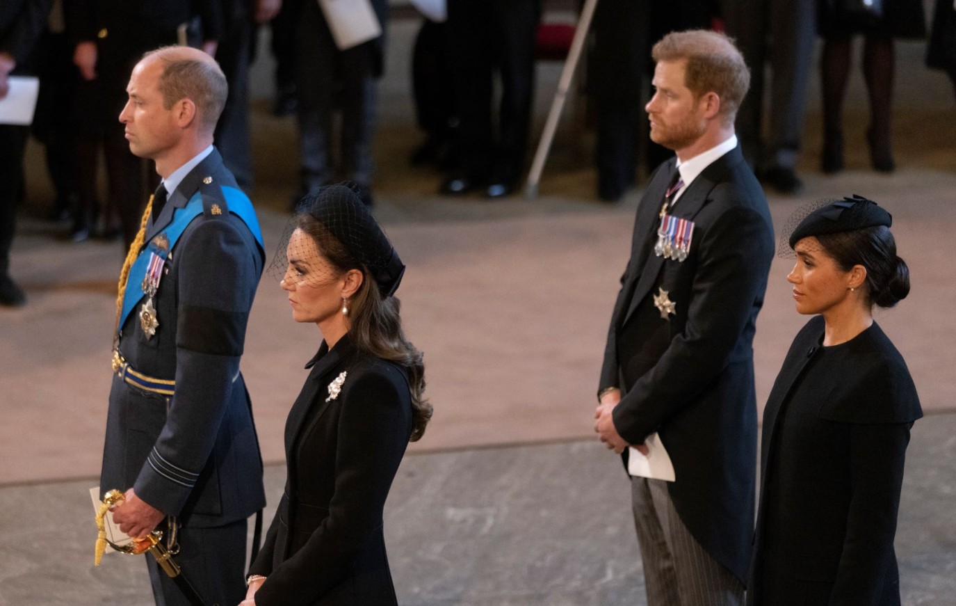 عندما تُوفيت الملكة إليزابيث في سبتمبر من عام 2022، حرص الأمير هاري وميغان ماركل على الانضمام لباقي أفراد العائلة المالكة لحضور الجنازة وما يسبقها من إجراءات تليق بملكة بريطانيا. لكنهما عندما حضرا جنازة الملكة في دير وستمنستر، جلس هاري وميغان خلف الملك والملكة كاميلا مباشرةً، بينما جلس الأمير ويليام وكيت ميدلتون في الصف الأمامي مع ابنيهما الأكبرين، الأمير جورج والأميرة شارلوت، على الجانب الآخر من ممر صغير من الملك والملكة. وعمد مسؤولو القصر إلى إبعادهما إلى الصف الثاني بالقرب من الأميرة بياتريس والأميرة يوجيني.