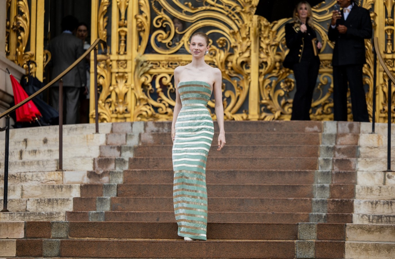 كانت إطلالة الممثلة وعارضة الأزياء هانتر شيفر في عرض سكياباريللي Schiaparelli بأسبوع الهوت كوتور في باريس لخريف وشتاء 20252026 حالمة وأنيقة، فقد تألقت بفستان أنيق بقصة مستقيمة وتوب بدون أكمام، صُمم من قماش المخمل باللون الأخضر الباستيل، مع خطوط ذهبية تُزين الفستان بالكامل، مما منحه فخامةً وأناقةً لا مثيل لها.