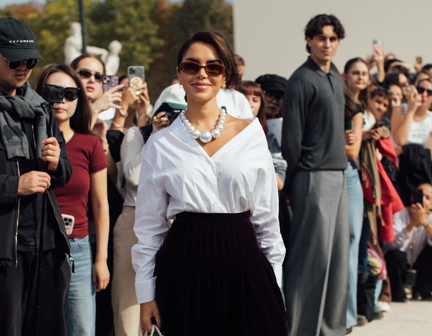 تألقت مدونة الموضة نجود الرميحي في إحدى إطلالاتها في شوارع باريس خلال أسبوع الموضة بأسلوب يمزج بين الرومانسية والأناقة المعاصرة، حيث اختارت تنورة ماكسي طويلة وواسعة من المخمل الداكن باللون البرغندي، ونسقت معها قميصاً أبيضَ كلاسيكياً بأكمام طويلة، ارتدته بأكتاف منسدلة قليلاً، وكان العقد المكون من حبات اللؤلؤ الكبيرة هو القطعة المميزة التي أضافت لمسة فخامة ورقي، مع نظارة شمسية بسيطة وحقيبة يد بيضاء صغيرة.