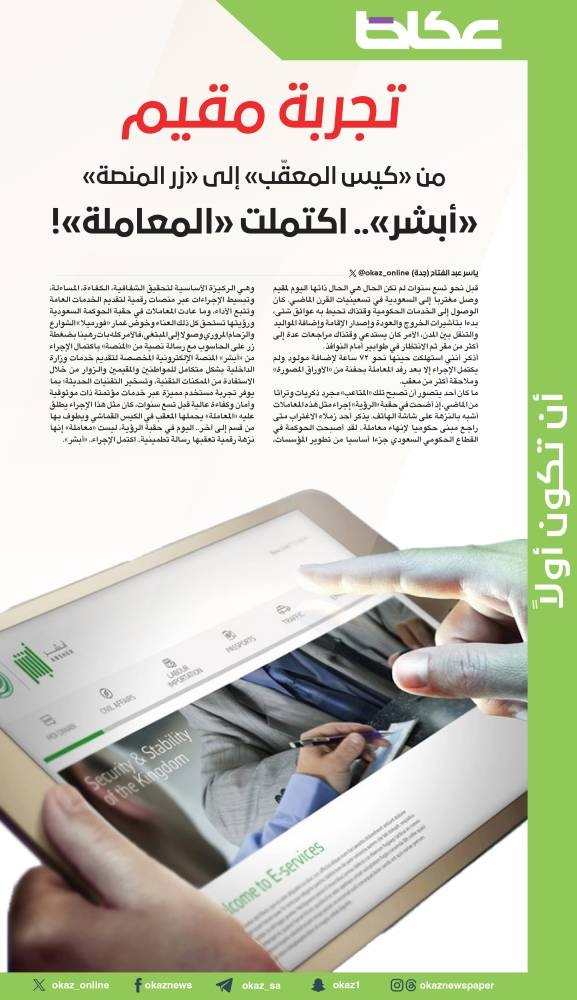 قبل نحو تسع سنوات لم تكن الحال هي الحال ذاتها اليوم لمقيم وصل مغتربا إلى السعودية في تسعينيات القرن الماضي. كان الوصول إلى الخدمات الحكومية وقتذاك تحيط به عوائق شتى، بدءا بتأشيرات الخروج والعودة وإصدار الإقامة وإضافة المواليد والتنقل بين المدن، الأمر كان يستدعي وقتذاك مراجعات عدة إلى أكثر من مقر ثم الانتظار في طوابير أمام النوافذ.