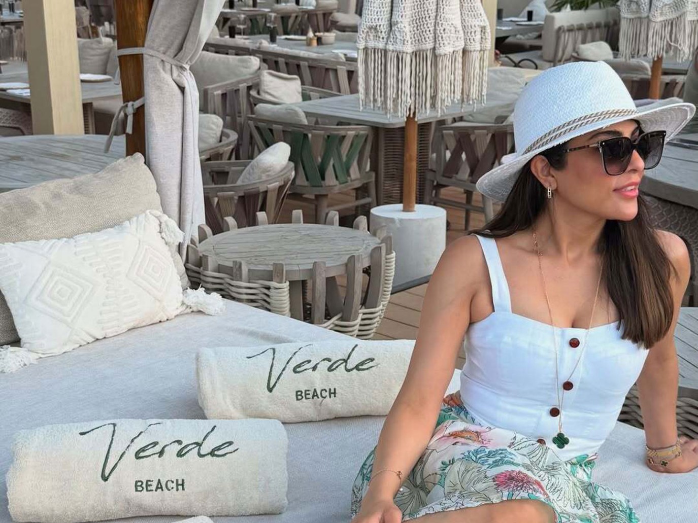 خلال عطلتها الصيفية، تألقت زارا البلوشي بإطلالة ساحرة باللون الأبيض، جمعت بين كروب توب أوف شولدر مزين بالكشاكش، وتنورة بليسيه قصيرة من الأمام وطويلة من الخلف بقماش الشيفون الناعم، نسَّقت معها قبعة قش بيج بشريط أسود ومجوهرات ذهبية.