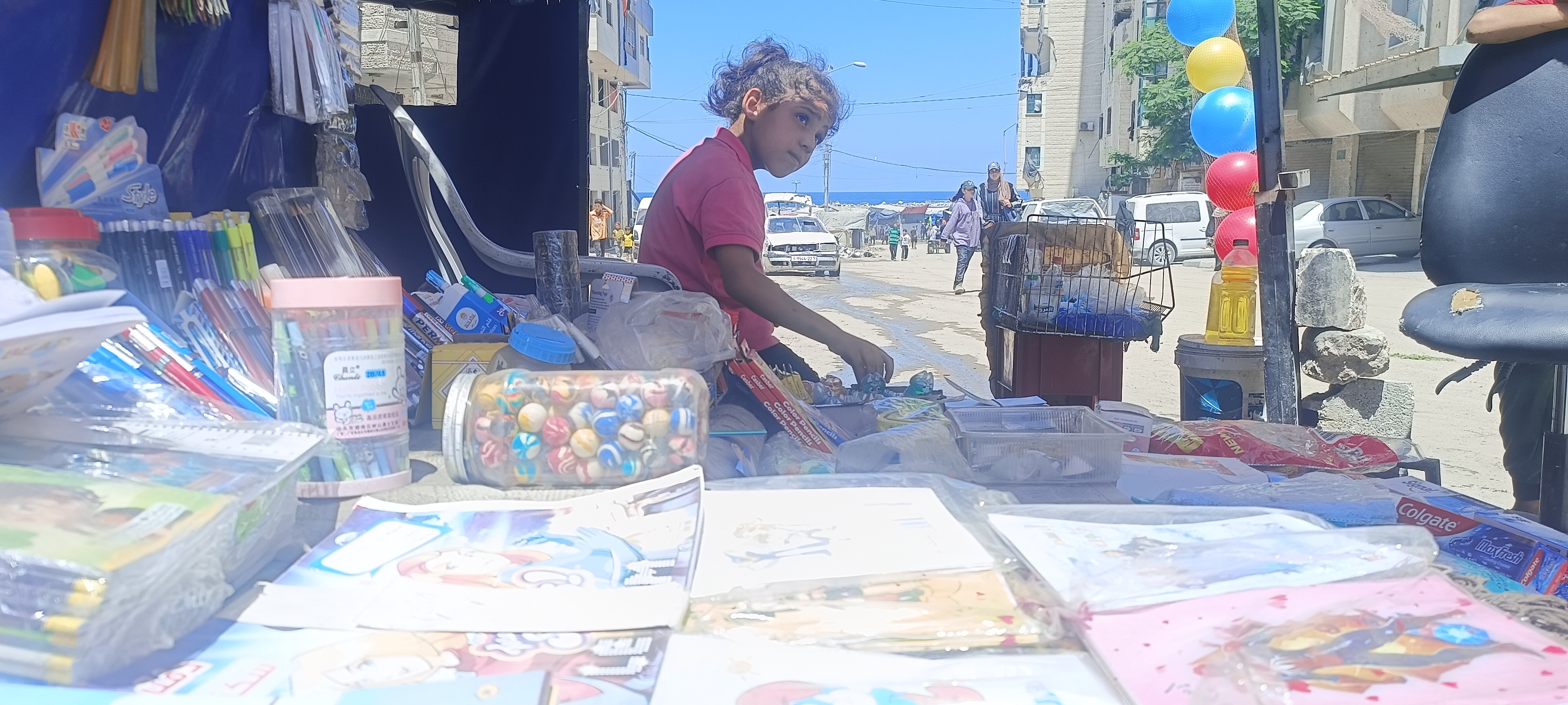 في شوارع غزة المدمرة، ينتشر الأطفال حاملين سلالًا صغيرة أو عربات خشبية يبيعون فيها الحلوى، المناديل، أو القهوة، بدلًا من الذهاب إلى المدارس.