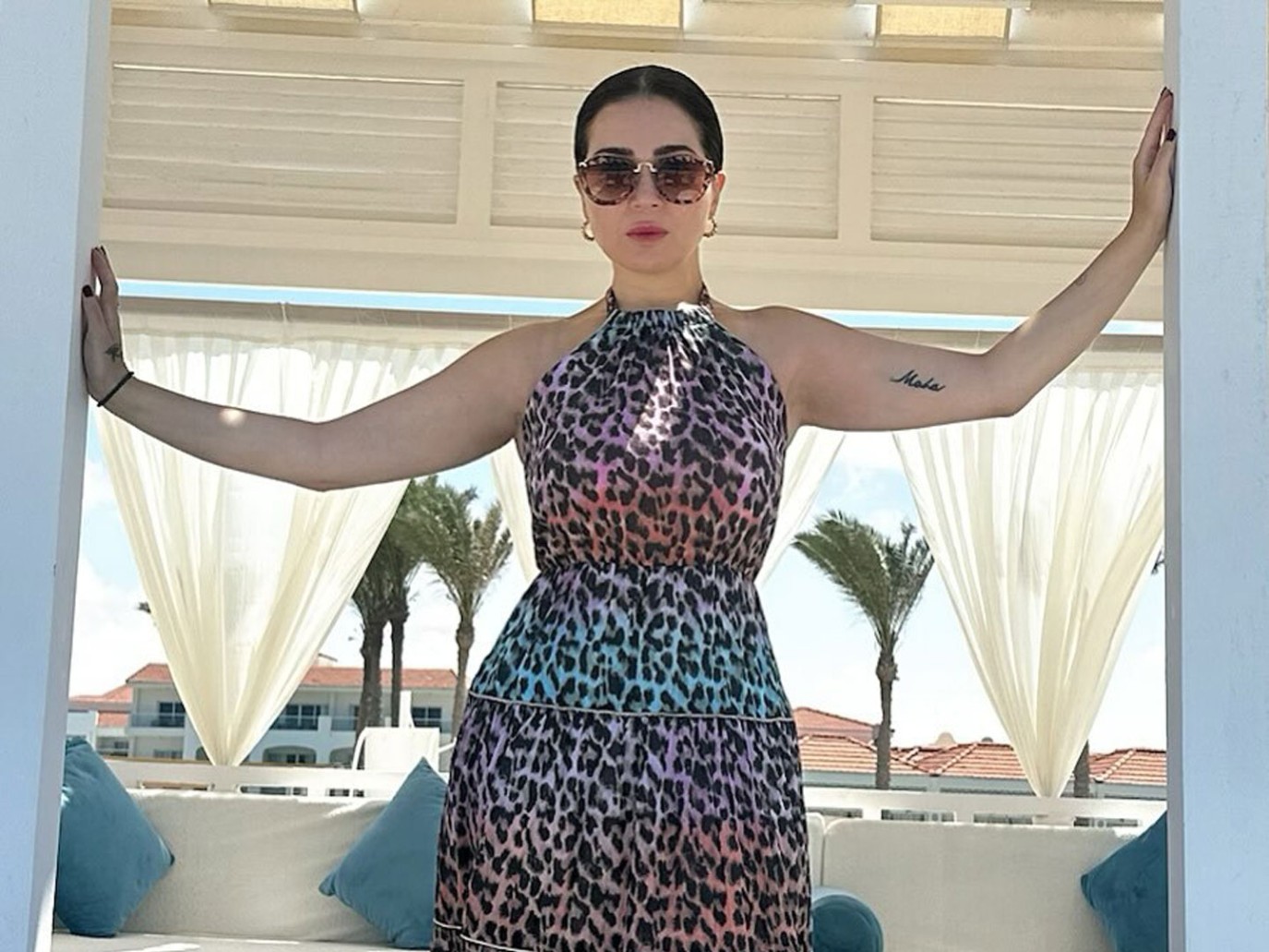 مي عز الدين بفستان نهاري صيفي بنقشة النمر