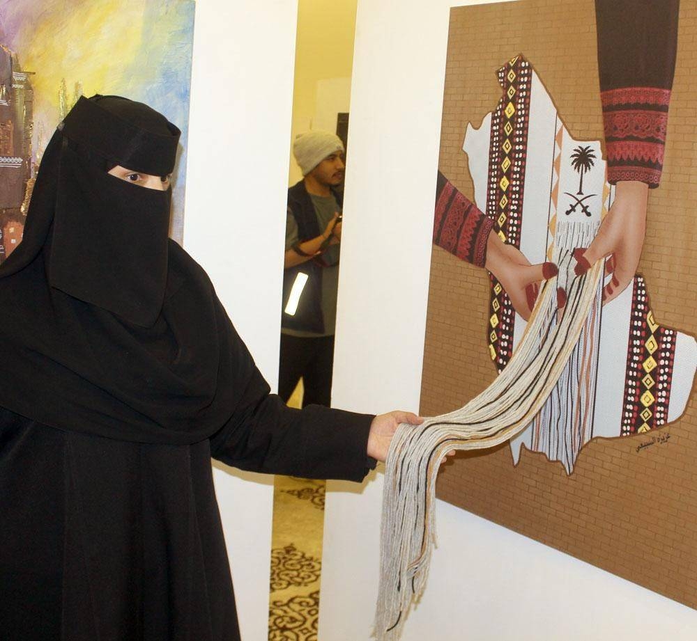 التشكيلية عبير الشامان تستعرض إحدى لوحاتها التي تحاكي السدو الذي يعد من أهم أنواع الحرف اليدوية التراثية السعودية، والذي يعبّر عن البيئة الصحراوية وأنماط الحياة القديمة، في معرض تراثيات الفن السعودي بتبوك. (تصوير: علي بدير)