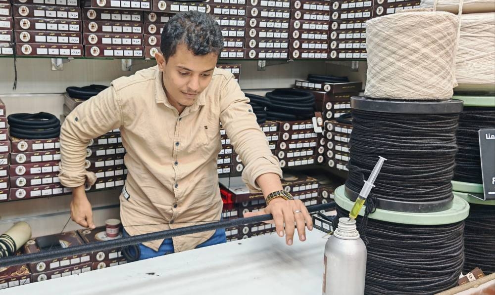 شاب يقوم بصناعة «العقل»، في أحد الأسواق الشعبية بجدة أمس. (تصوير: مديني عسيري)