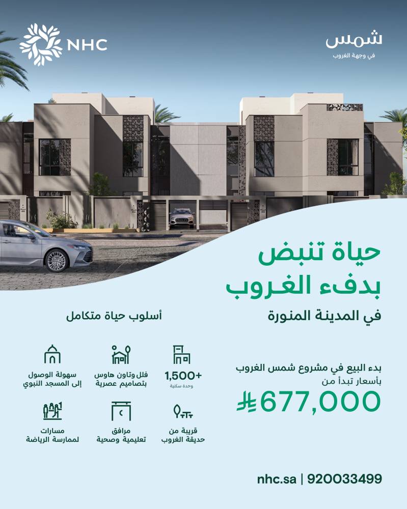 أعلنت NHC بدء البيع في مشروعها الجديد «شمس»، أحدث مشاريع وجهة الغروب غرب المدينة المنورة، والذي يمثل نموذجًا حديثًا للتخطيط العمراني المتكامل، وذلك في إطار جهودها المتواصلة لتوفير خيارات سكنية متنوعة تدعم جودة الحياة وفق أعلى المعايير.