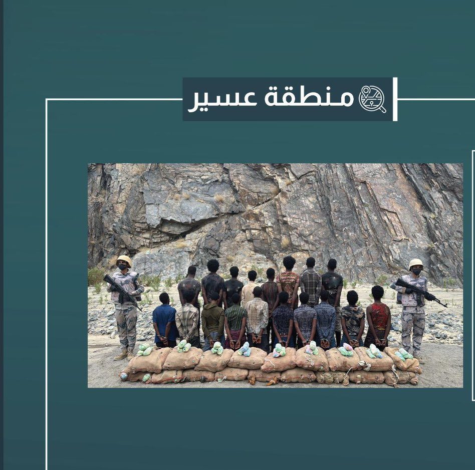 قبضت الدوريات البرية لحرس الحدود في قطاع الربوعة بمنطقة عسير على (18) مخالفًا لنظام أمن الحدود من الجنسية الإثيوبية، لتهريبهم (270) كيلوجرامًا من نبات القات المخدر، واستُكملت بحقهم الإجراءات النظامية الأولية بتسليمهم والمضبوطات لجهة الاختصاص.