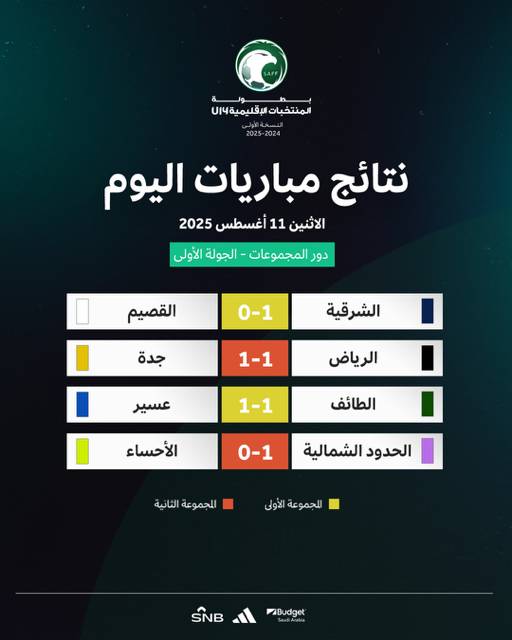 وتُقام اليوم (الثلاثاء) 4 مباريات تجمع الشرقية مع الطائف، الرياض مع الحدود الشمالية، القصيم مع عسير، وجدة أمام الأحساء.