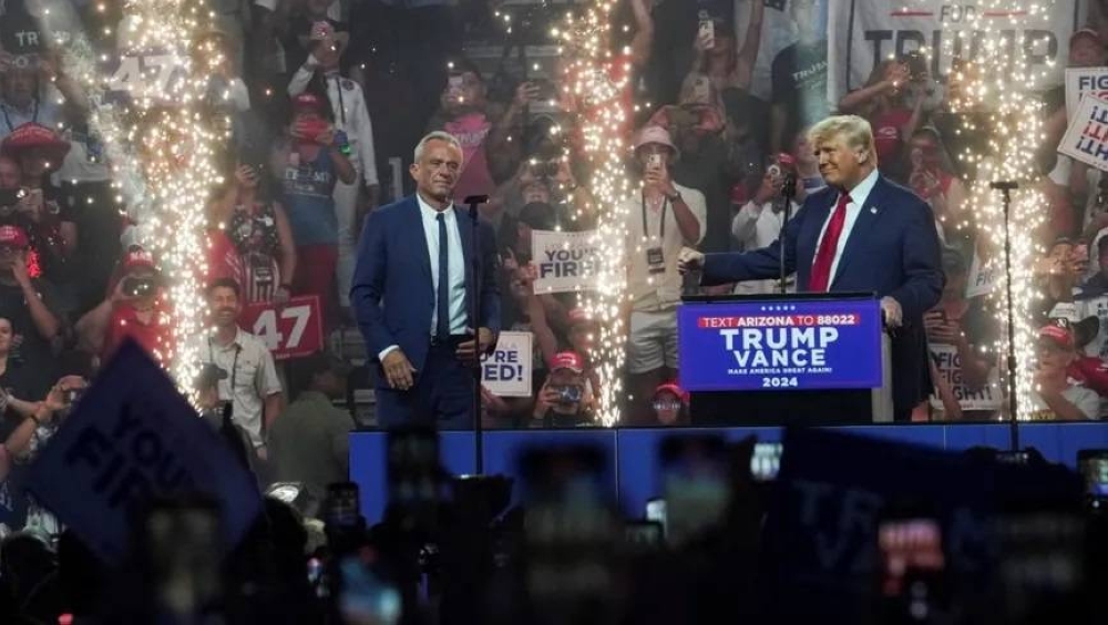 فيما أعلن مكتب رئيس الشرطة في مقاطعة كوتشيس بولاية أريزونا الأمريكية، القبض على رجل كان مطلوباً بعد أن هدد عبر وسائل التواصل الاجتماعي بقتل الرئيس السابق دونالد ترمب، ظهر المرشح المستقل في الانتخابات الرئاسية الأمريكية روبرت كينيدي الابن اليوم (السبت) إلى جانب المرشح الجمهوري ترمب على خشبة المسرح في تجمع انتخابي حاشد بولاية أريزونا، وذلك بعد ساعات من إعلانه تعليق حملته وتأييد المرشح الجمهوري.