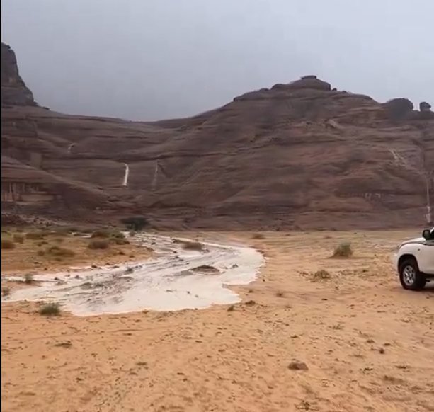 وبين مقطع الفيديو تم تداوله على مواقع التواصل الاجتماعي، كيف جرت السيول بعد تساقط كميات غزيرة من الأمطار على محافظات الرياض مع رياح نشطة باردة.