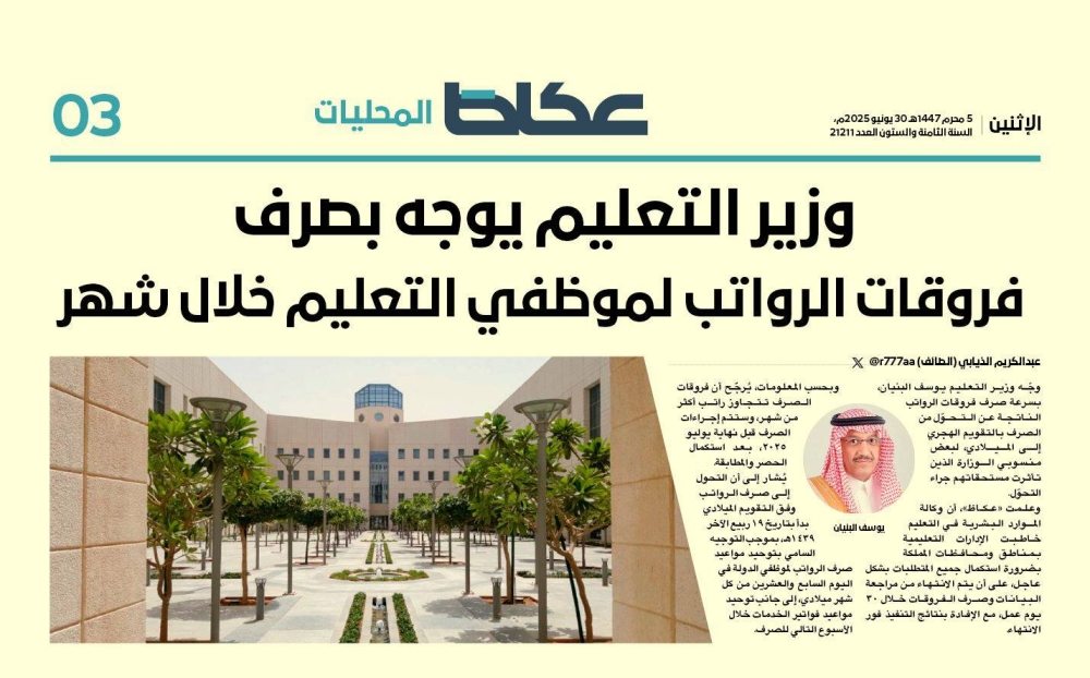 وكانت «» قد انفردت بنشر توجيه وزير التعليم يوسف البنيان، بسرعة صرف فروقات الرواتب الناتجة عن التحوّل، لمن تأثرت مستحقاتهم من منسوبي الوزارة، على أن تُراجع البيانات ويتم الصرف خلال 30 يوم عمل.