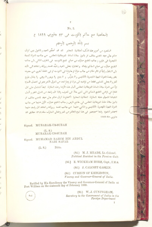 المقصود من تحرير هذا الصك الحقانية المعتبر أنه قد تحقق العهد والقبول بين كرنل ملكم جان ميد اندين ستاف كار باليوز جلالة الملكة البريطانية العظمى من جانب الدولة البهية القيصرية في طرف، وجناب الشيخ مبارك بن صباح شيخ الكويت في الطرف الثاني بأن جناب الشيخ مبارك بن صباح المذكور برضائه واختياره يعطي العهد ويقيّد نفسه وورثته وأخلافه إلى الأبد بأن لا يقبل وكيلاً أو قائم مقام من جانب دولةٍ أو حكومةٍ في الكويت أو في قطعة أخري من حدوده بغير رخصة الدولة البهية القيصرية الإنكليس، ولا يفوض ولا يبيع ولا يؤجر ولا يرهن ولا ينقل بنوع آخر ولا يعطي للسكون قطعة من أراضيه إلى دولة، أو رعية من الدول الأخرى بغير أن يحصل الإجازة أولاً من الدولة جلالة الملكة البريطانية العظمى لأجل هذه الإرادة وهذه المقاولة أيضًا تشتمل على كل قطعة من أراضي الشيخ المذكور التي تكون حالاً في تصرف رعايا كل واحد من الدول الغير ولأجل الشهادة لتكميل هذه المقاولة الحقانية المعتبرة المحترمة كرنل ملكم جان ميد اندين ستاف كار باليوز جلالة ملكة البريطانية العظمى في خليج فارس وجناب الشيخ مبارك، الأول منهما من جانب الدولة البهية القيصرية الإنكليس والثاني منهما من جانب نفسه وورثته وأخلافه كل واحد منهما بمحضر الشهود وضعًا صحيحهم في هذا اليوم العاشر من شهر رمضان المبارك سنة 1316 مطابق 23 جنيوري سنة 1899.