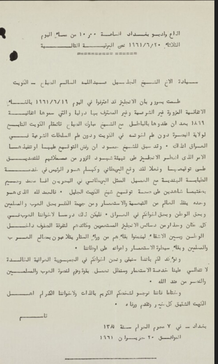 علمت بسرور بأن الإنجليز قد اعترفوا في يوم 19/6/1961 بإلغاء الاتفاقية المزورة غير الشرعية وغير المعترف بها دوليًا، والتي سموها اتفاقية 1899 بعد أن عقدوها بالباطل مع الشيخ مبارك الصباح، قائمقام الكويت التابع لولاية البصرة دون علم إخوته في الكويت، ودون علم السلطات الشرعية في العراق آنذاك، وقد سبق للشيخ حمود أن رفض التوقيع عليها أو تنفيذها الأمر الذي اضطر الإنجليز على تهيئة شهود الزور من عملائهم للتصديق على توقعيها وفعلا لقد وقّع البريطاني وكهام هور الرئيس في خدمة الطبابة الهندية مع العميل الممثل البريطاني في البحرين آغا محمد رحيم بصفتهما شاهدين على صحة توقيع شيخ الكويت الجليل. فالحمد لله الذي هو وحده ينقذ العالم من التبعية والاستعمار ومن جريمة الكفر بحق العرب والمسلمين، وبحق الوطن وبحق إخوانكم في العراق. فليكن ذلك درسًا لإخواننا العرب في كل مكان وحذار من دسائس الإنجليز المستعمرين وكائدهم لتفرقة الصفوف داخل الوطن وبين الأشقاء ليضمنوا بقاءهم من وراء الستار يتلاعبون بمصالح العرب والمسلمين وبقاء سيطرة الاستعمار واعوانه على أوطاننا. ونؤكد لكم أننا سنبقى ونحن إخوانكم من الجمهورية العراقية الخالدة، لا تنطلي علينا خدعة الاستعمار، وسنظل نعمل بقوة وعزم لنصرة العرب والمسلمين والنصر من عند الله. وختامًا فإننا نرجو لشخصكم الكريم بالذات ولإخواننا الكرام أهل الكويت الشقيق كل خير وتقدم ورفاه"(14).