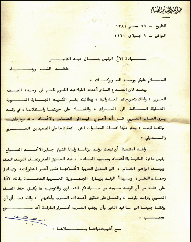 ولقد استنسبنا أن نبعث بوفد برئاسة ولدنا جابر الأحمد الصباح رئيس دائرة المالية والاقتصاد وعضوية السادة: عبد العزيز الصقر، ونصف اليوسف النصف، ويوسف إبراهيم الغانم إلى الدول العربية لاطلاعها على آخر التطورات وتبادل وجهات النظر، وسيبدأ الوفد بزيارة الجمهورية العربية المتحدة، وذلك لأننا على ثقة من أن الوفد سيجد من سيادتكم التعاون والتوجيه ما يكفل حفظ الصف العربي وتراصه وقوته، والعمل على تحقيق أهداف العرب وأمانيهم، والله نسأل أن يوفقنا جميعًا على ما فيه الخير وأن يجنب العرب أضرار التفرقة إنه سميع مجيب.
