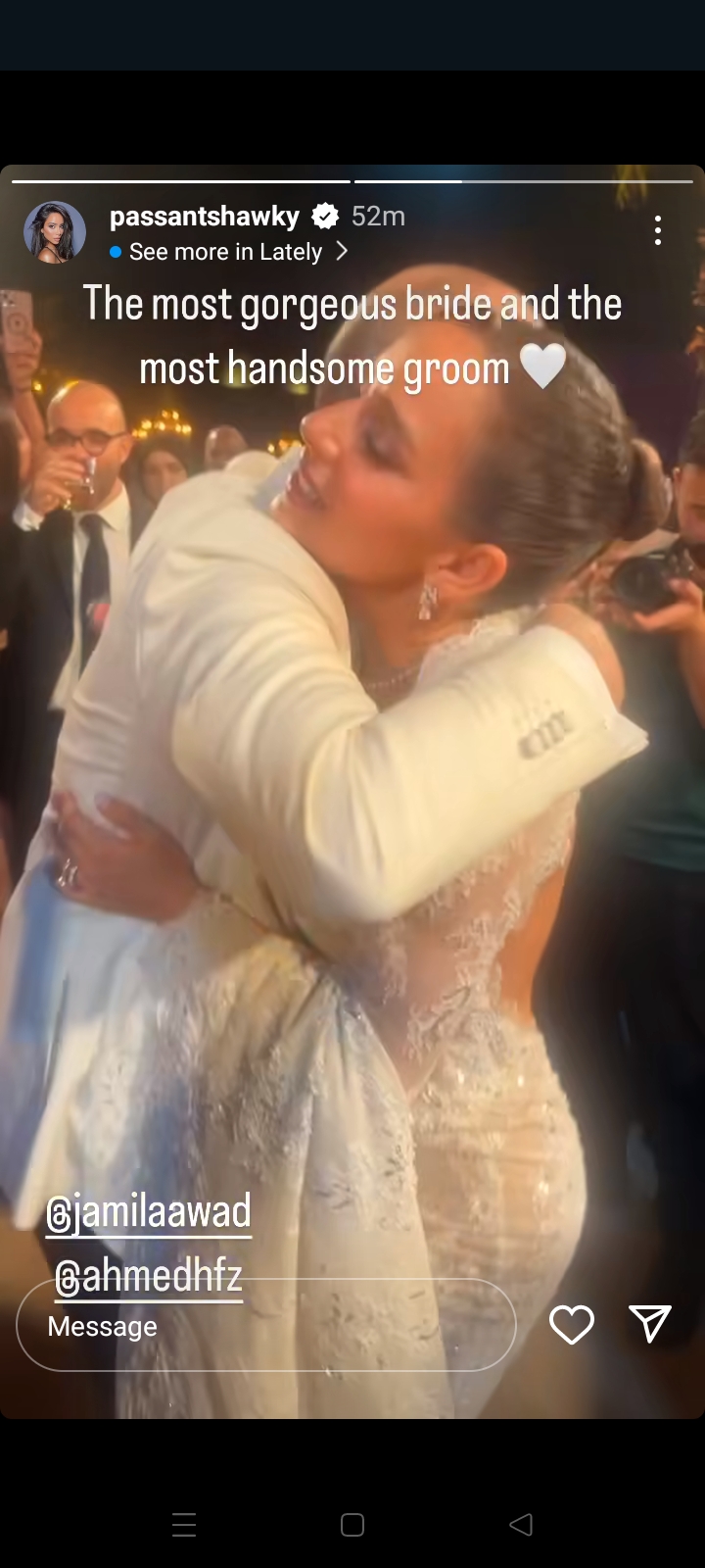 هنأت الفنانة بسنت شوقي الفنانة جميلة عوض بمناسبة زفافها اليوم المقام بالقلعة على المونتير أحمد حافظ، حيث نشرت بسنت شوقي فيديو من حفل زفاف جميلة عوض وذلك عبر خاصية القصص بصفحتها الرسمية بموقع تبادل الصور والفيديوهات الشهير “إنستجرام” حيث نشرت الفيديو وعلقت عليه قائلة: “أجمل عروسة وأجمل عريس”.