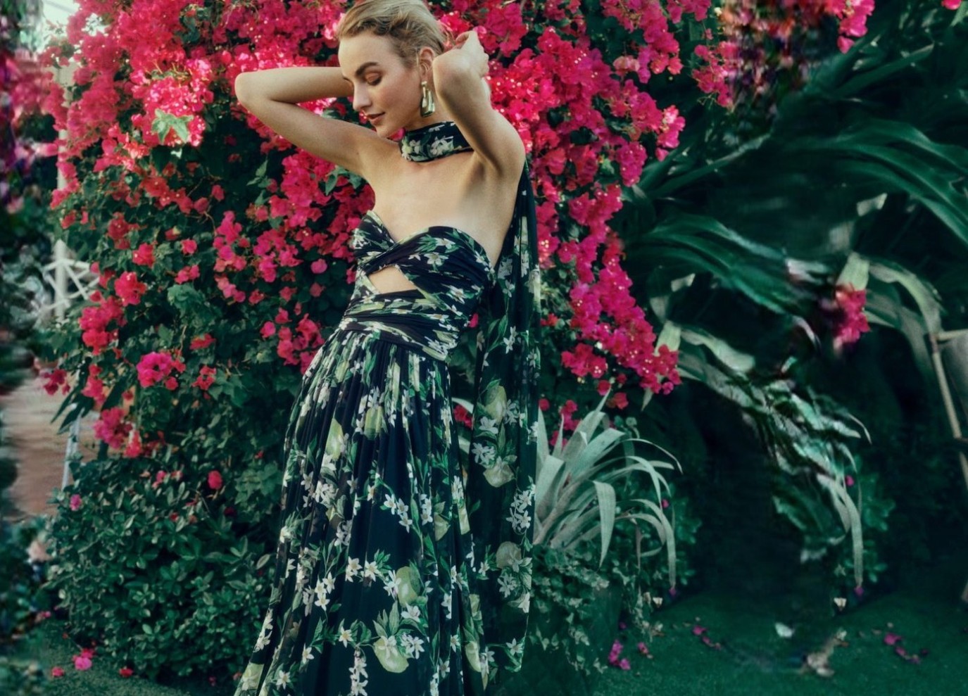 اخترنا لك فستاناً مطبعاً برسوم تجسد النباتات الخضراء باللونين الأخضر والأسود، وهو من تصميم مونيك لويلييه Monique Lhuilier، ويتسم بربطات معقودة عند الخصر والبطن ويتسم بتفريغ عند البطن، وهو متصل بالتنورة المنسدلة بطيات عريضة طويلة تكاد تلامس الأرض. كما يمكنك تنسيق وشاح من القماش نفسه حول عنقك.