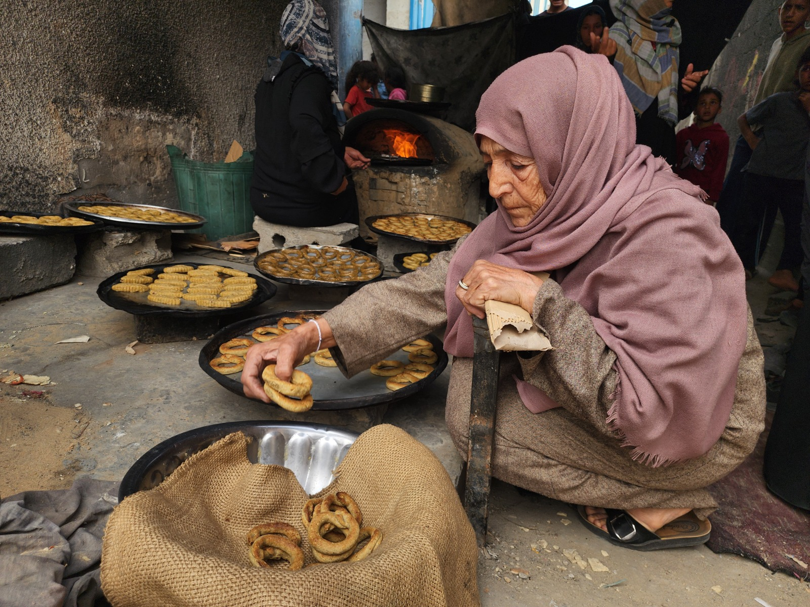الفلسطينية "أم محمد" تحاول تعويض أطفالها وأحفادها عن مستلزمات العيد، بـ"توفير الكعك لهم".