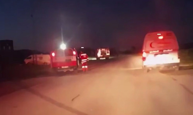 يُرى عناصر من الدفاع المدني، لا يقل عددهم عن اثنين، وهم يرتدون الزي الرسمي، يخرجون من شاحنة الإطفاء وسيارة إسعاف تحمل شعار الهلال الأحمر، ويتجهون نحو سيارة الإسعاف المنحرفة إلى جانب الطريق. ثم، تبدأ أصوات إطلاق نار كثيف. ويُرى ويُسمع في الفيديو وابل من الرصاص يصيب القافلة.