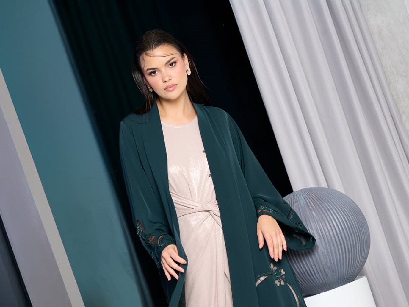 كلما كانت العباية ناعمة وخالية من التفاصيل المزدحمة سيمنحك ذلك مظهراً شبابياً، خاصةً إذا كانت مصممة بقياسات مضبوطة على الكتفين مثل العباية الخضراء الداكنة التي حملت توقيع ماركة لوزان Louzan المزينة بزخارف بسيطة في القسم السفلي منها فقط، ارتديها في المساء مع فستان نيود طويل بشرط أن يكون سادة، وانتعلي صندل Mule أسود أو اختاريه من لون الفستان، واحملي كلاتش صغيراً أسود مزوداً بسلسال ذهبي، وزيني أذنيك بأقراط Hoops صغيرة مصممة من الذهب الأصفر.