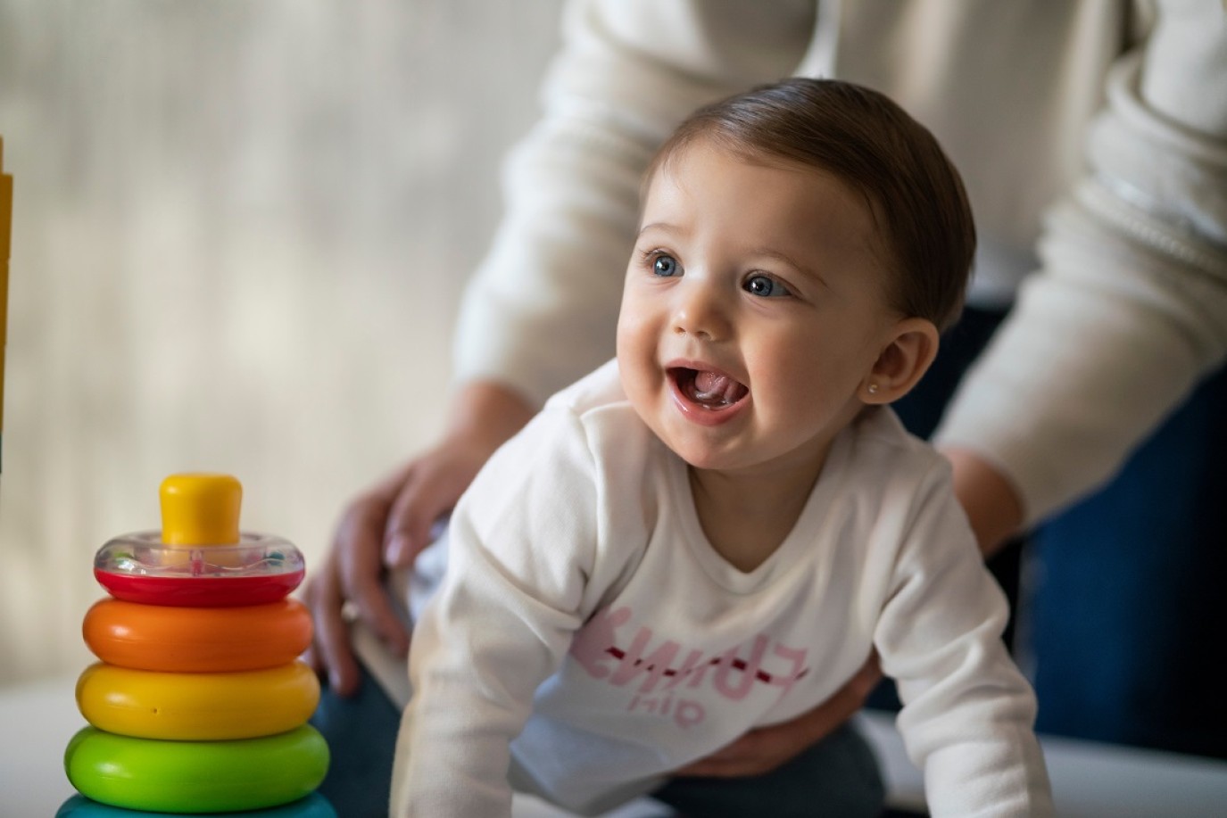 يعجب الرضيع بالألعاب الصغيرة الطرية والمرنة والقابلة للتشكيل، ويحب أن يلمسها بيديه.