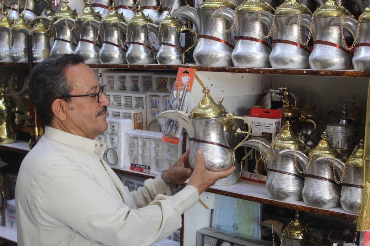 البائع صالح عبدالله يستعرض دِلال القهوة العربية في سوق قلعة تبوك التراثية. (تصوير: علي بدير)