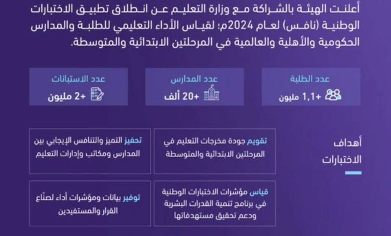 هيئة تقويم التعليم والتدريب تطلق الاختبارات الوطنية “نافس” في جميع مدارس المملكة الابتدائية والمتوسطة