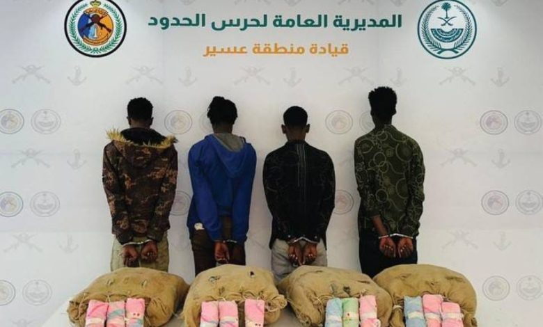 القبض على 4 مخالفين لنظام أمن الحدود لتهريبهم 80 كيلوغراماً من القات المخدر بعسير