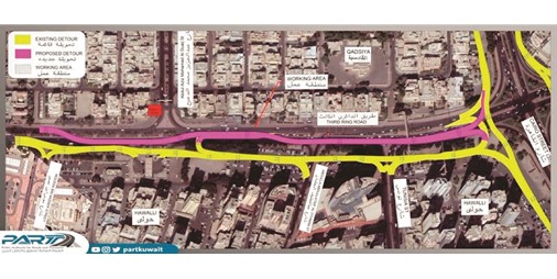 قالت الهيئة العامه للطرق والنقل البري إنها وبالتعاون مع الإدارة العامة للمرور ستقوم بافتتاح التحويلة المرورية على طريق الدائري الثالث بين منطقتي القادسية وحولي، وذلك لاستكمال أعمال الطرق الرئيسية والخدمات، وذلك فجر الأحد 14 الجاري.