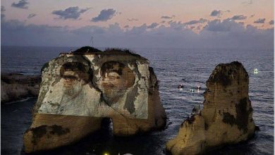 حزب الله يكسر قرار الحكومة بإضاءة صخرة الروشة بصور نصرالله وصفي الدين