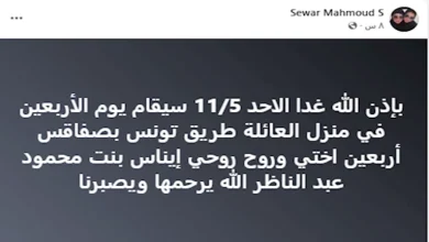 اليوم.. أسرة إيناس النجار تحيي ذكرى مرور 40 يوما على فاتها