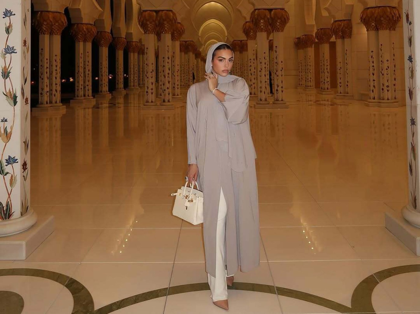 في أحدث إطلالاتها بأبو ظبي، وتحديداً في مسجد الشيخ زايد، اعتمدت جورجينا رودريغيز عباية باللون البيج، تميز بالطابع الراقي والمحتشم، وقد ظهرت بإطلالة بسيطة تجمع بين العباية والحجاب باللون نفسه، مع بنطلون أوف وايت بقصّة مستقيمة وواسعة، وأكملت إطلالتها بحقيبة هيرميس باللون الأوف وايت، وحذاء بيج.