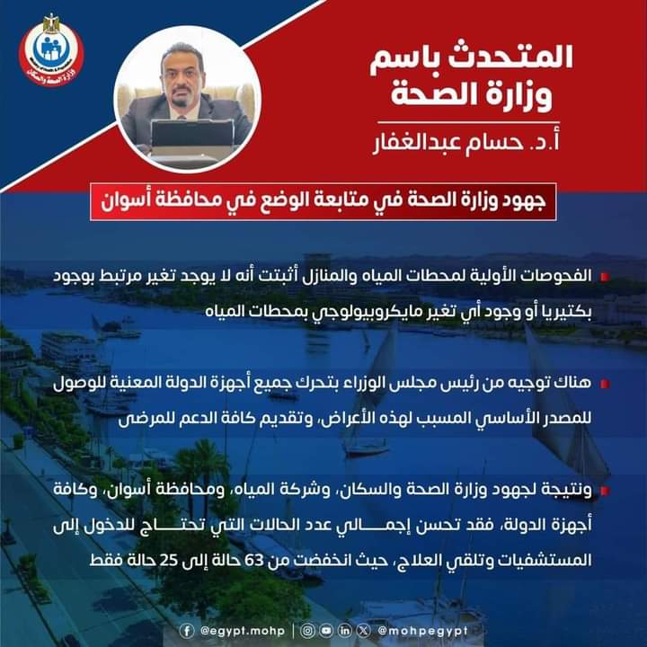 فيما كانت تأكيدات الصحة بأسوان، أن الأنباء حول تلوث مياه الشرب ووفاة 6 أشخاص نتيجة لذلك غير صحيحة. وذكر أن معظم الحالات ناتجة عن فيروسات موسمية أو تناول أطعمة ملوثة، وهو ما يُعد شائعًا خلال فصل الصيف، نافيًا أن تكون المياه هي السبب المباشر وراء الإصابات.