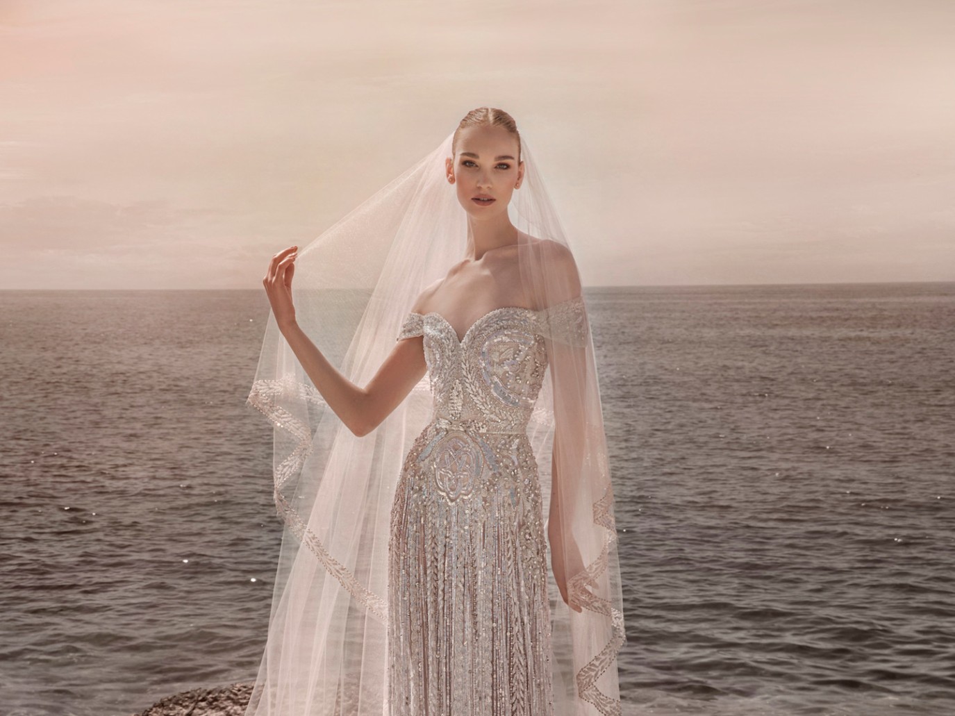 نرشّح أيضاً لعروس هذا الصيف، فساتين الزفاف المصممة من خامات شفافة مثل الشيفون، والتي يفضّل أن تكون مشغولة بالتطريز، كما في الفستان منسدل الأكمام الذي تألّقت به عارضة المصمم زهير مراد Zuhair Murad. لائميه مع قلادة ناعمة وأقراط متدلية قصيرة من الذهب الأبيض.