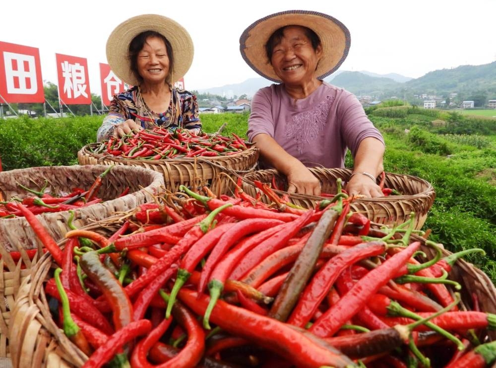 يدخل الفلفل الأحمر العضوي في فصل الصيف فترة النضج. وفي الصورة مزارعان بقرية ليانججيانا التابعة لمقاطعة سيتشوان الصينية، أثناء حصاد محصول الفلفل. (إيكونومي دايلي الصينية)