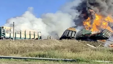 مشهد مرعب على القضبان.. قطار بنزين يصطدم بشاحنة وتشتعل النيران “فيديو”