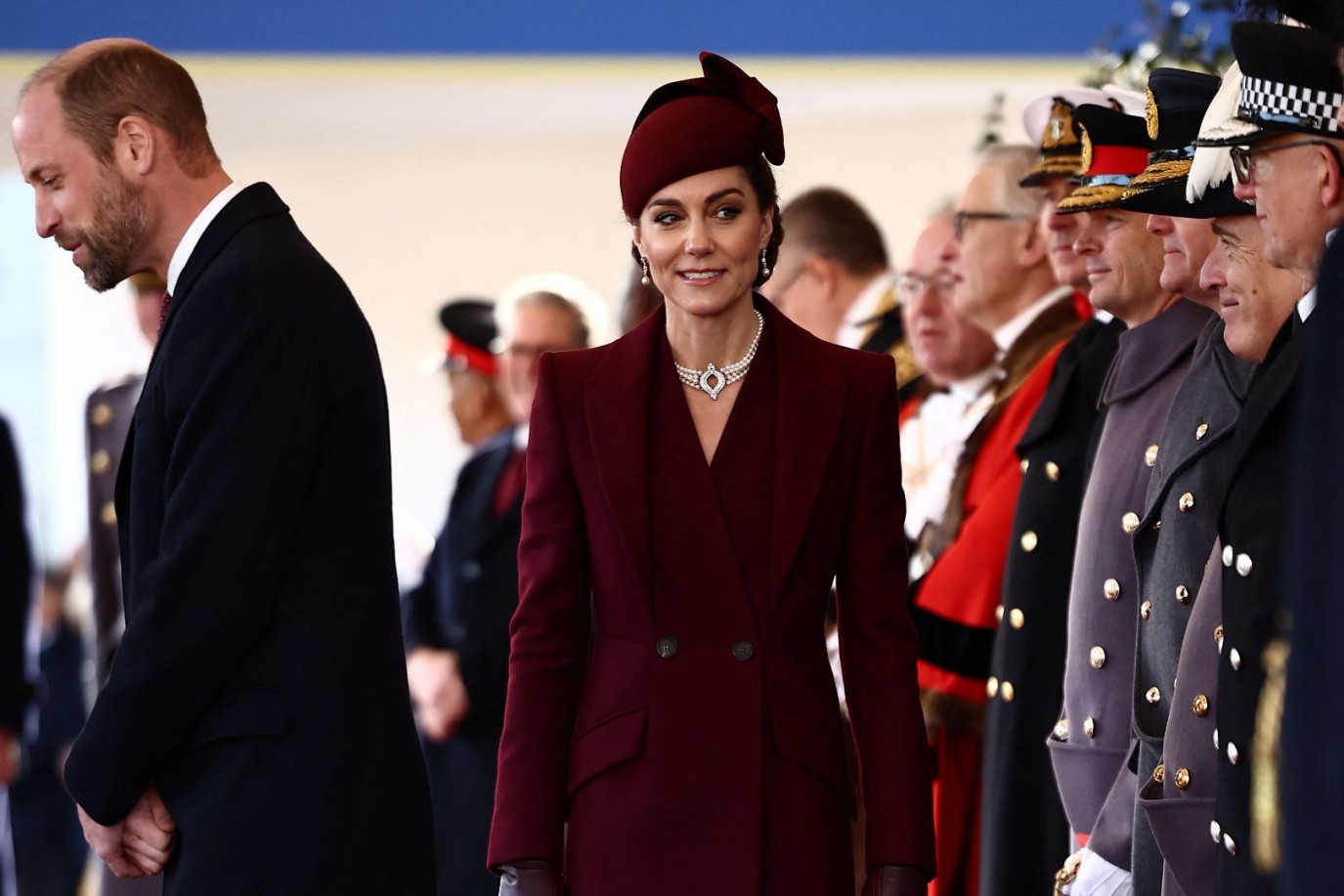 وعندما شاركت في استقبال أمير قطر الشيخ تميم بن حمد آل ثاني وعقيلته، اختارت كيت أميرة ويلز إطلالة باللون العنابي الداكن مستوحية ألوان إطلالتها من ألوان العلم القطري لتظهر تقديرها واحترامها للضيوف وكلفتة دبلوماسية شديدة الكياسة. الفستان المعطف الذي ارتدته حمل توقيع سارة بورتون من ألكسندر ماكوين Alexander McQueen وقد نسقته الأميرة مع مجوهرات من اللؤلؤ كانت ملكاً للملكة الراحلة.