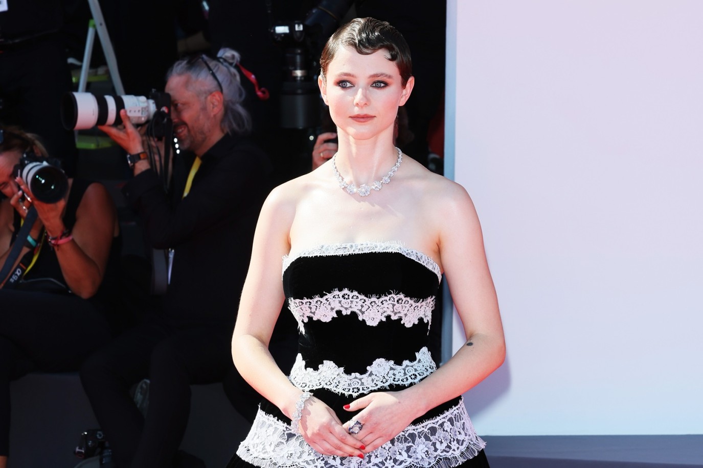 توماسين ماكنزي Thomasin McKenzie ارتدت فستاناً من مجموعة الملابس الجاهزة لربيع صيف 2024 من رودارت Rodarte باللون الأسود مع تقليمات من الدانتيل الأبيض قسمت الفستان إلى أجزاء، ونسقت إطلالتها مع عقد وسوار مرصعين بالألماس يتمتعان بتصميم زهور الدانتيل المخرمة تماثلا مع تصميم الدانتيل الذي زين الفستان.